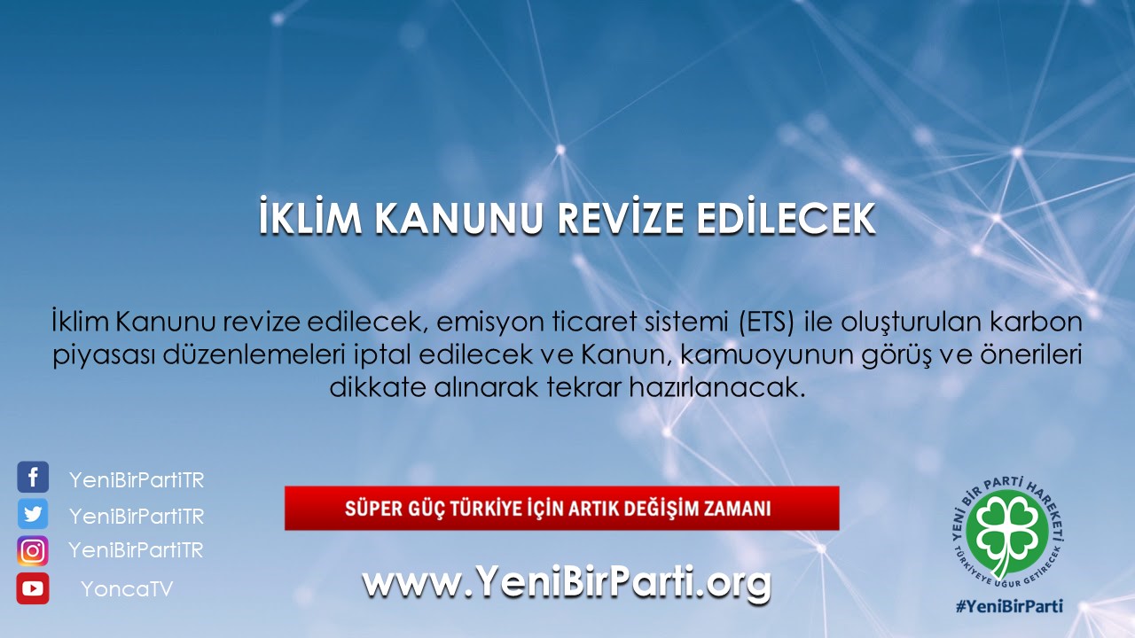 - İklim Kanunu revize edilecek, emisyon ticaret sistemi (ETS) ile oluşturulan karbon piyasası düzenlemeleri iptal edilecek ve Kanun, kamuoyunun görüş ve önerileri dikkate alınarak tekrar hazırlanacaktır.