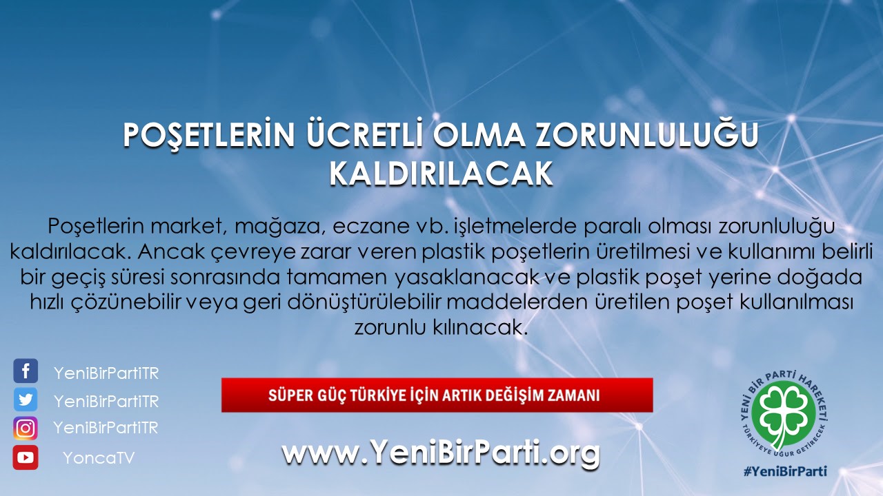 - Poşetlerin market, mağaza, eczane vb. işletmelerde paralı olması zorunluluğu kaldırılacak ancak çevreye zarar veren plastik poşetlerin üretilmesi ve kullanımı belirli bir geçiş süresi sonrasında tamamen yasaklanacak ve plastik poşet yerine doğada hızlı çözünebilir veya geri dönüştürülebilir maddelerden üretilen poşet kullanılması zorunlu kılınacaktır.