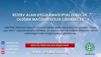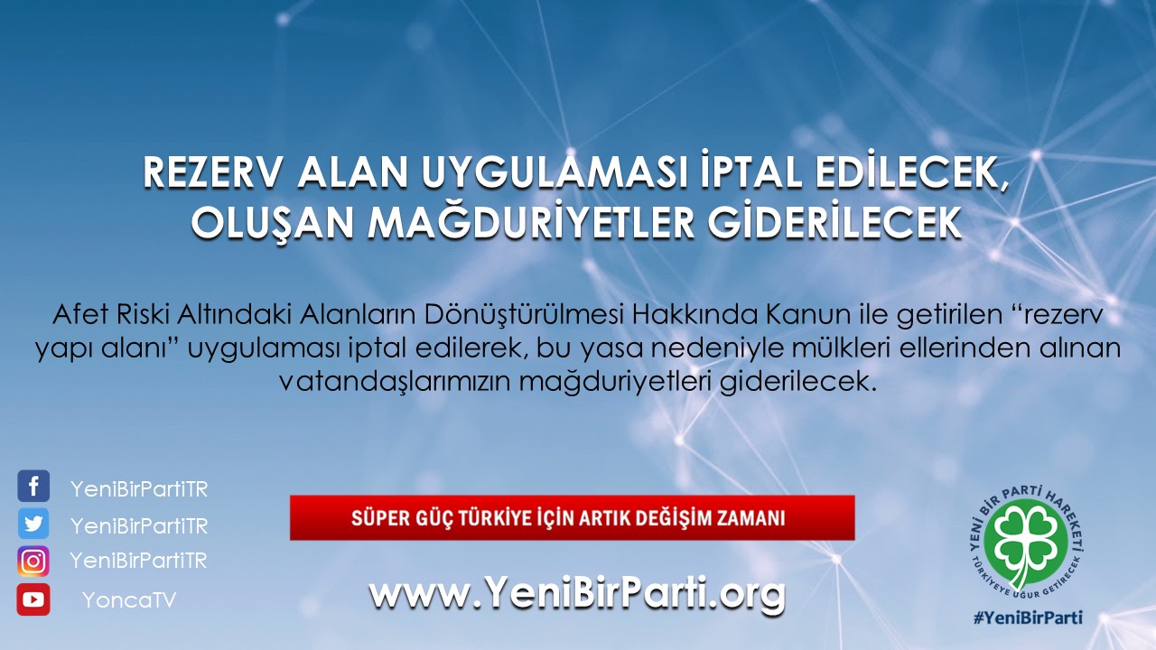 - Afet Riski Altındaki Alanların Dönüştürülmesi Hakkında Kanun ile getirilen “rezerv yapı alanı” uygulaması iptal edilerek, bu yasa nedeniyle mülkleri ellerinden alınan vatandaşlarımızın mağduriyetleri giderilecektir.