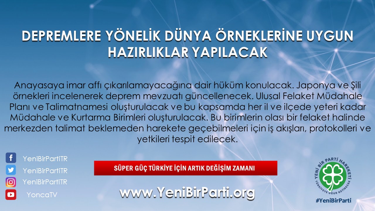 - Japonya ve Şili örnekleri incelenerek deprem mevzuatı güncellenecek, bu kapsamda deprem bölgelerindeki yapılaşmayı düzenlemeye yönelik olarak Deprem Kanunu hazırlanacaktır. Deprem bölgelerinde gerçekleştirilecek yeniden yapılanma, fay hattına yakın bölgelerde müstakil evler şeklinde yapılarak şehirleşme yayılacaktır. Yeniden inşa edilecek konutlarda beton yerine çelik konstrüksiyon tercih edilmesi teşvik edilecektir. Kamu binaları ve yüksek katlı binalar için sismik izolatörler zorunlu kılınacaktır.
