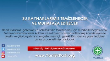 - Deniz kıyılarımız, göllerimiz ve nehirlerimizin temizlenmesi için seferberlik başlatılacaktır. Su kaynaklarımızın temiz kalması ve su kaynaklarımıza arıtılmamış kanalizasyon ile plastik ve çöp boşaltımının engellenmesi için gerekli tüm idari ve yasal tedbirler alınacak ve denetimler artırılacaktır.