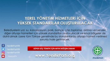 - Belediyelerin yol, su, kanalizasyon, park, bahçe, çöp toplama, arıtma ve benzeri diğer altyapı hizmetleri için yüksek standartlar oluşturulacak ve kırsal bölgeler de dahil olmak üzere tüm Türkiye genelinde bu standartlarda altyapı hizmeti verilmesi zorunlu hale getirilecektir.
