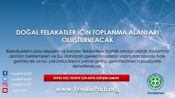 - Belediyelerin olası deprem ve benzeri felaketlere hazırlık amaçlı olarak toplanma alanları belirlemeleri ve bu alanlarda gerekli hazırlıkları yapmaları zorunlu hale getirilecek ve bu yükümlülüklerini yerine getirip getirmedikleri hassasiyetle denetlenecektir.