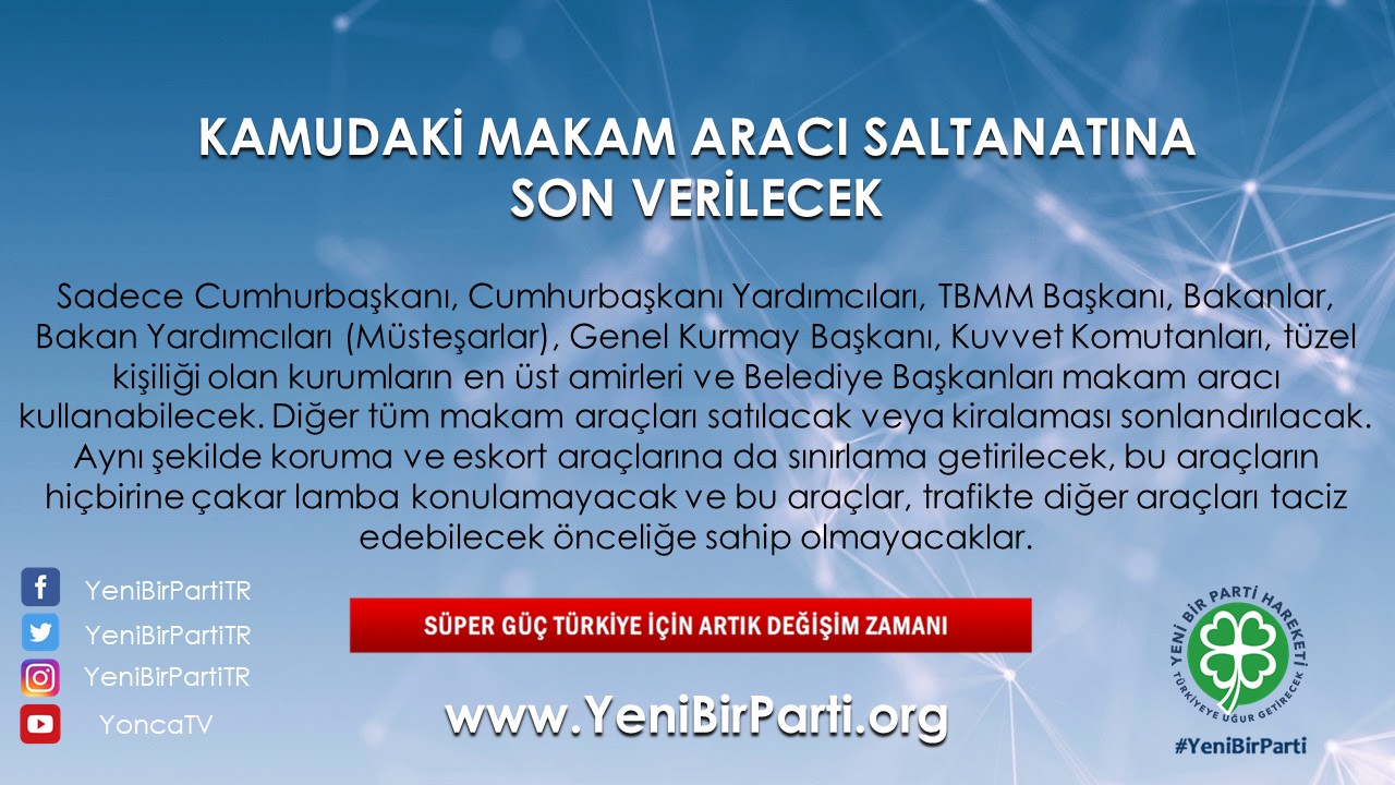 - Sadece Cumhurbaşkanı, Cumhurbaşkanı Yardımcıları, TBMM Başkanı, Bakanlar, Bakan Yardımcıları (Müsteşarlar), Genel Kurmay Başkanı, Kuvvet Komutanları, tüzel kişiliği olan kurumların en üst amirleri ve Belediye Başkanları makam aracı kullanabilecek, diğer tüm makam araçları satılacak veya kiralaması sonlandırılacaktır. Diğer üst düzey bürokratlar, ihtiyaç halinde kurumlarına tahsis edilen hizmet araçlarını kullanacaklar, ancak hizmet araçlarını makam aracı gibi kullananlara disiplin cezaları uygulanacak ve idari görevlerine son verilecektir.