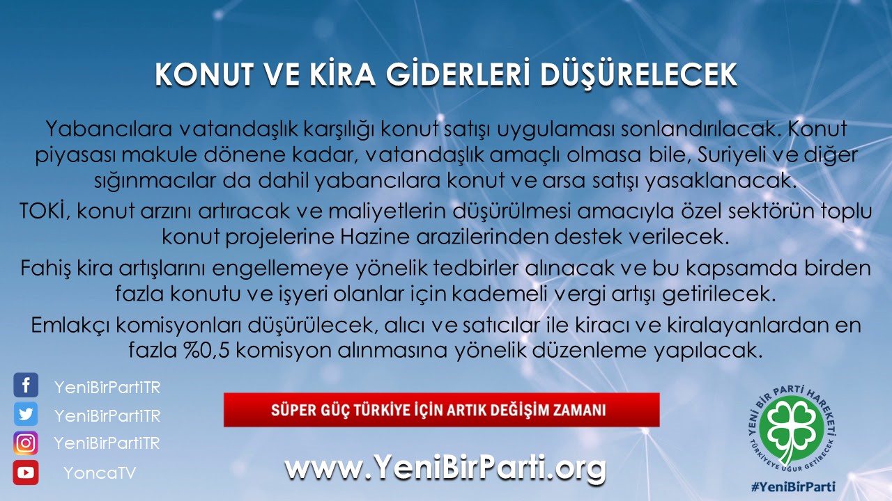 - Yabancılara vatandaşlık karşılığı konut satışı uygulaması sonlandırılacaktır. Konut piyasası makule dönene kadar, vatandaşlık amaçlı olmasa bile, yabancılara ve sığınmacılara konut ve arsa satışı yasaklanacaktır.