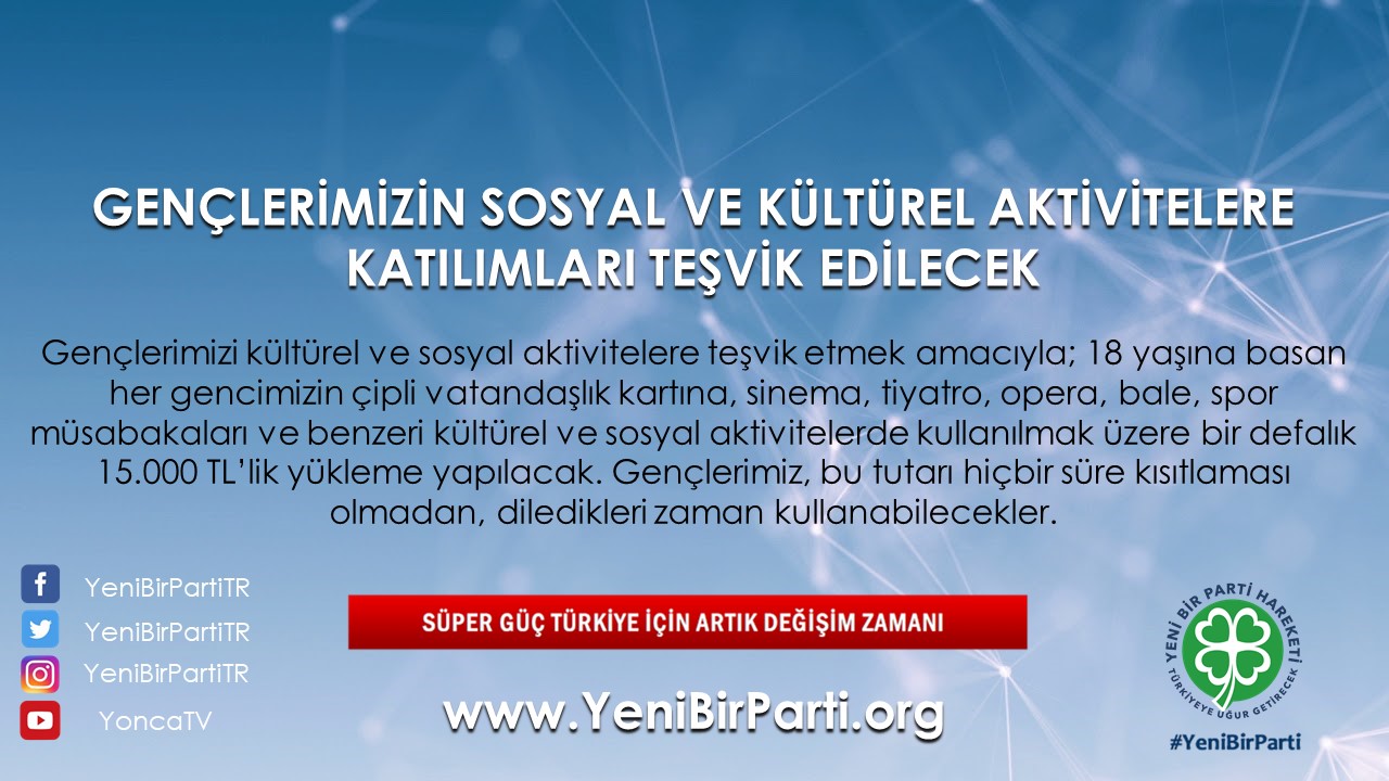 - Gençlerimizi kültürel ve sosyal aktivitelere teşvik etmek amacıyla; 18 yaşına basan her gencimizin çipli vatandaşlık kartına, sinema, tiyatro, opera, bale, spor müsabakaları ve benzeri kültürel ve sosyal aktivitelerde kullanılmak üzere bir defalık 15.000 (onbeşbin) TL’lik yükleme yapılacaktır. Gençlerimiz, bu tutarı hiçbir süre kısıtlaması olmadan, diledikleri zaman kullanabileceklerdir.