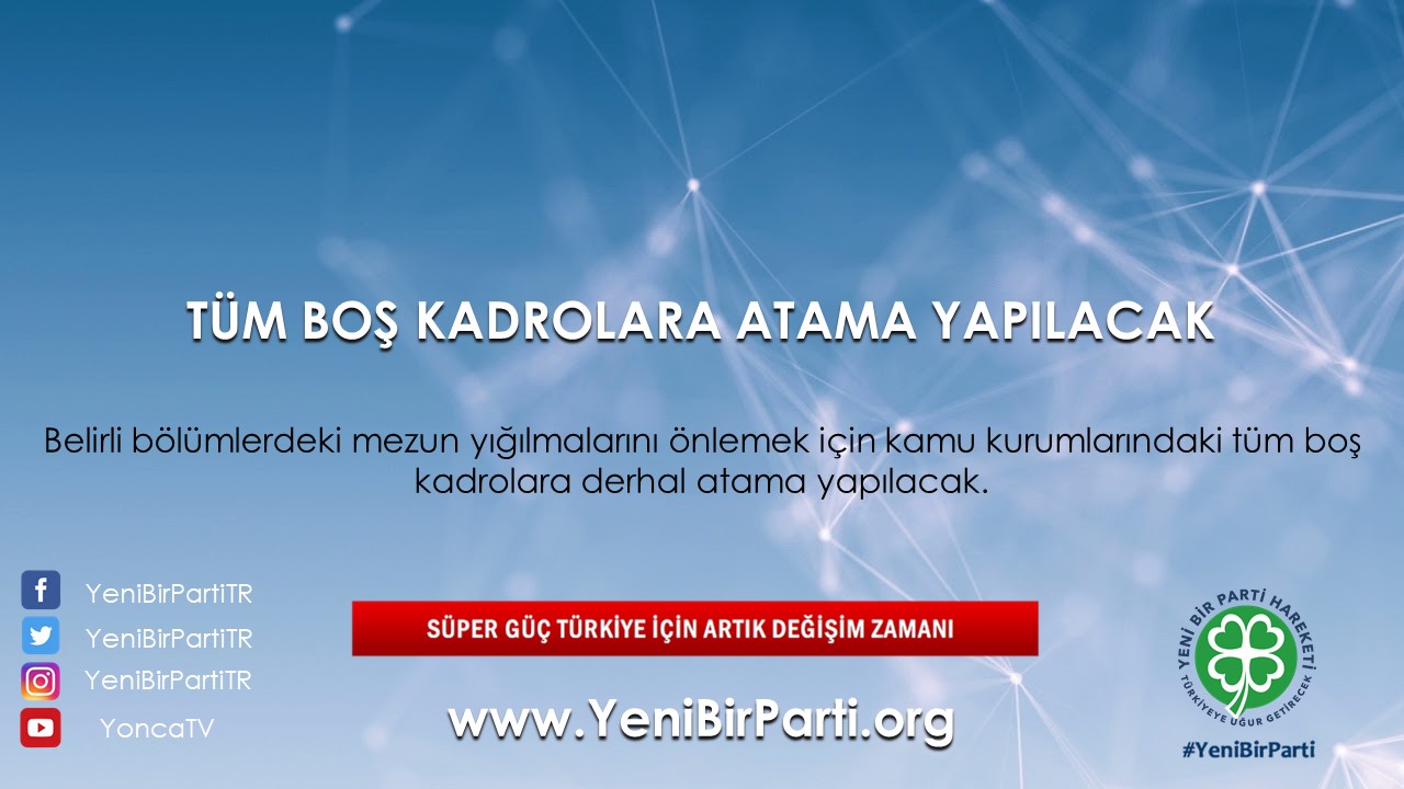 - Belirli bölümlerdeki mezun yığılmalarını önlemek için kamu kurumlarındaki tüm boş kadrolara derhal atama yapılacaktır.