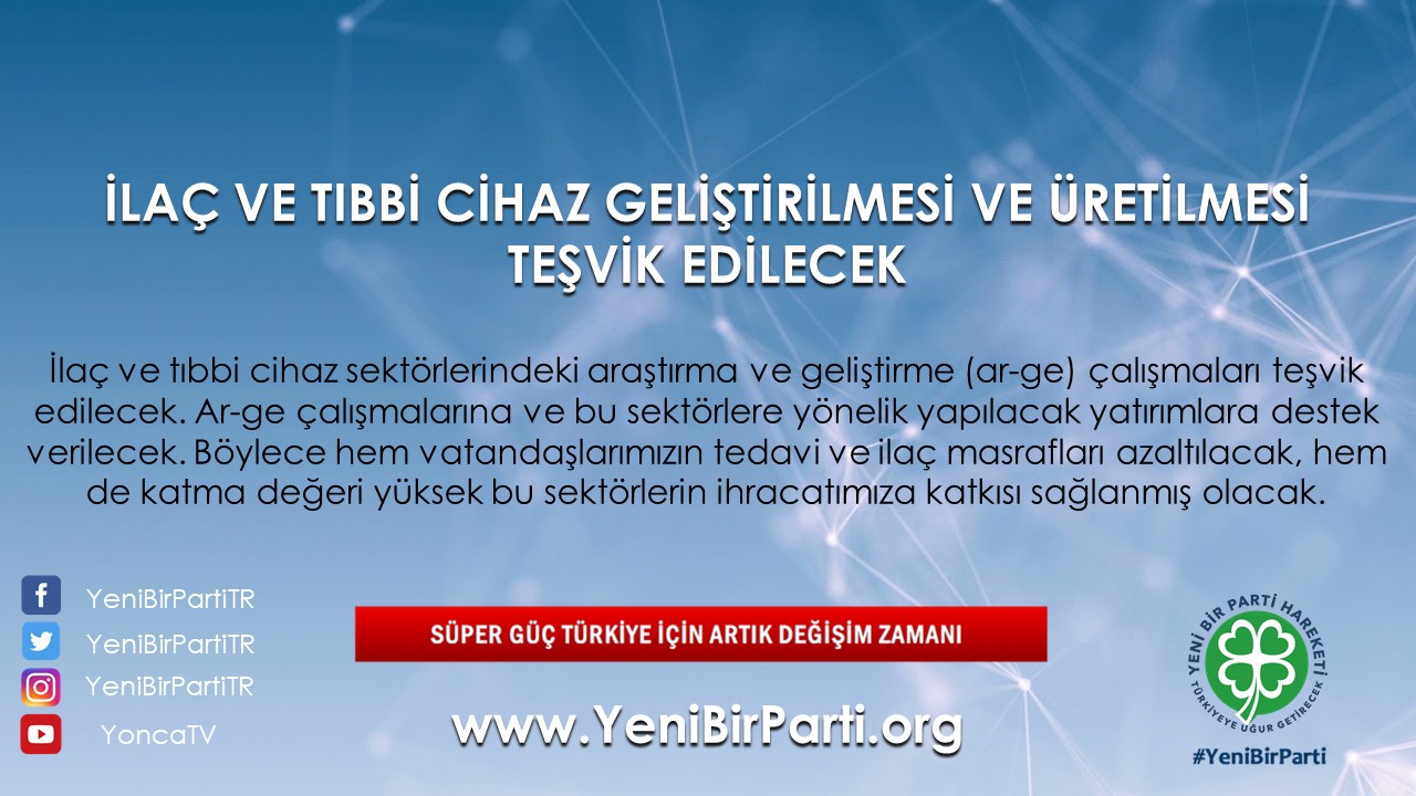 - İlaç sektörlerindeki araştırma ve geliştirme (ar-ge) çalışmaları teşvik edilecek ve ar-ge çalışmaları ile Türkiye’de bu sektörlere yönelik yapılacak yatırımlara destek verilecektir.