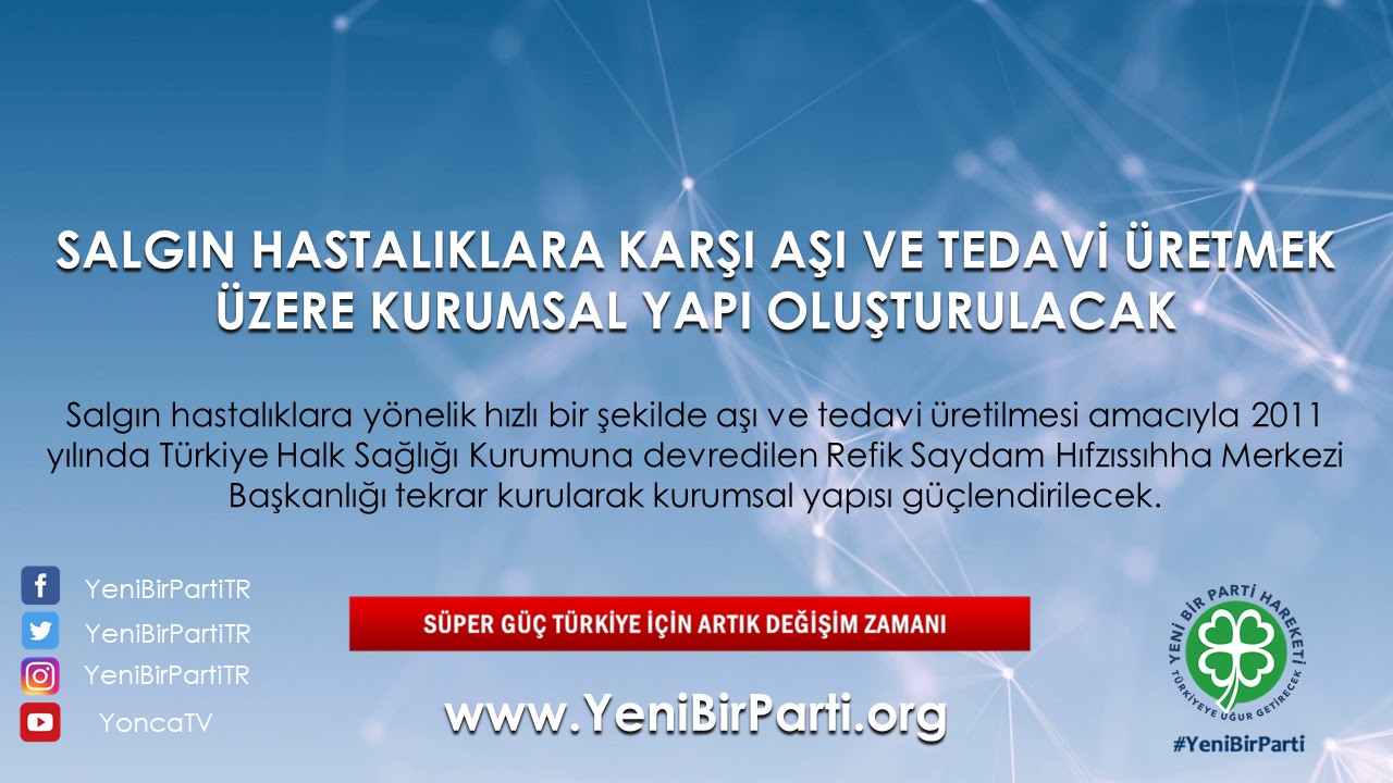 - Salgın hastalıklara yönelik hızlı bir şekilde aşı ve tedavi üretilmesi amacıyla 2011 yılında Türkiye Halk Sağlığı Kurumuna devredilen Refik Saydam Hıfzıssıhha Merkezi Başkanlığı tekrar kurularak kurumsal yapısı güçlendirilecektir.