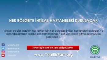 - Türkiye’de çok görülen hastalıklar için her bölgede ihtisas hastaneleri açılacak ve vatandaşlarımızın tedavi için ikametlerinden çok uzak illere gitme zorunluluğu kaldırılacaktır.