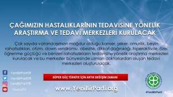 - Çok sayıda vatandaşımızın mağdur olduğu kanser, şeker, omurilik, kas ve beyin rahatsızlıklarının tedavisine yönelik araştırma merkezleri kurulacak ve bu merkezler bünyesinde uzman doktorlardan oluşan tedavi merkezleri oluşturulacaktır. Bu Merkezlere ülkemizde ve dünyada yetişmiş akademisyen ve araştırmacılar davet edilecek ve Ar-Ge faaliyetleri için yeterli bütçe ayrılacaktır.