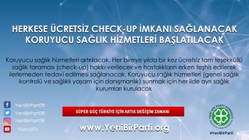- Her bireye yılda bir kez ücretsiz genel sağlık kontrolü (check-up) hakkı sağlanacak ve hastalıkların erken teşhis edilerek ilerlemeden tedavi edilmesi sağlanacaktır.