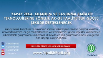 - Yapay zekâ, kuantum ve savunma sanayii teknolojileri alanlarında çalışma yürüten üniversitelerimize, ar-ge merkezlerimize ve firmalarımıza güçlü teşvikler verilecek ve ülkemizdeki çalışmaların uluslararası düzeyde en ileri çalışmalar olması için gerekli tüm altyapı oluşturulacaktır.