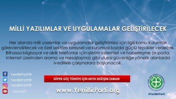 - Her alanda milli yazılımlar ve uygulamalar geliştirilmesi için ilgili kamu kurumları görevlendirilecek ve özel sektöre bireysel ve kurumsal bazda güçlü teşvikler verilecektir. Bilhassa bilgisayar ve akıllı telefonlar için işletim sistemleri ve haberleşme (e-posta, internet üzerinden arama ve mesajlaşma) gibi ulusal güvenliğe yönelik alanlarda ivedilikle çalışmalara başlanacaktır.