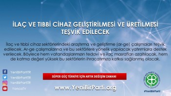 - İlaç ve tıbbi cihaz sektörlerindeki araştırma ve geliştirme (ar-ge) çalışmaları teşvik edilecek; ar-ge çalışmalarına ve bu sektörlere yönelik yapılacak yatırımlara destek verilecektir. Böylece hem vatandaşlarımızın tedavi ve ilaç masrafları azaltılacak, hem de katma değeri yüksek bu sektörlerin üretim ve ihracatımıza katkısı sağlanmış olacaktır.