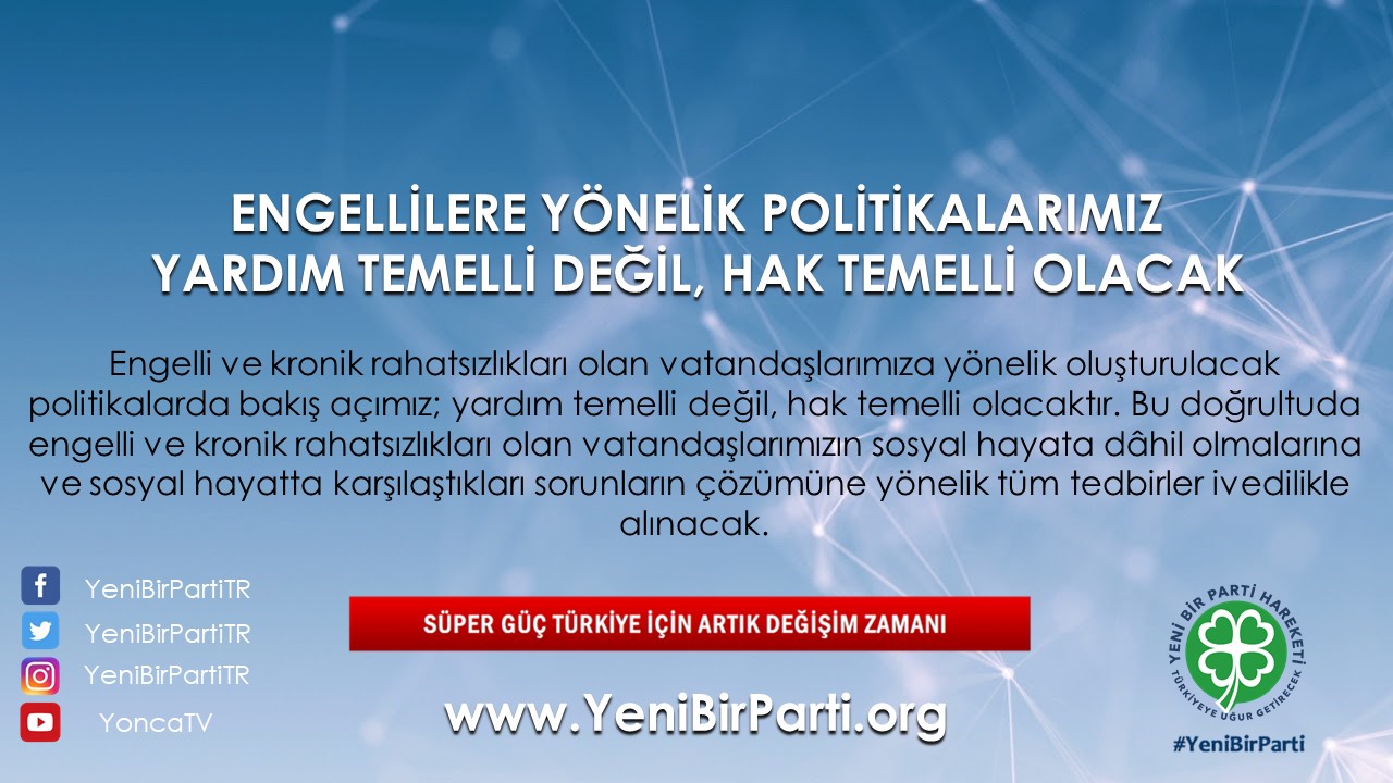 - Engelli ve kronik rahatsızlıkları olan vatandaşlarımıza yönelik oluşturulacak politikalarda bakış açısı; yardım temelli değil, hak temelli olacaktır. Bu doğrultuda engelli ve kronik rahatsızlıkları olan vatandaşlarımızın sosyal hayata dâhil olmalarına ve sosyal hayatta karşılaştıkları sorunların çözümüne yönelik tüm tedbirler ivedilikle alınacaktır.