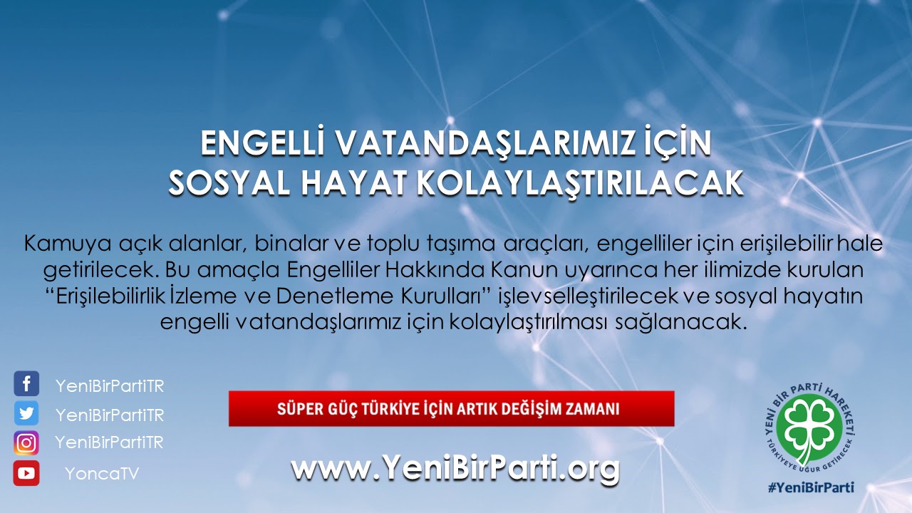 - Kamuya açık alanlar, binalar ve toplu taşıma araçları, engelliler için erişilebilir hale getirilecektir. Bu amaçla Engelliler Hakkında Kanun uyarınca her ilimizde kurulan “Erişilebilirlik İzleme ve Denetleme Kurulları” işlevsel hale getirilecek ve sosyal hayatın engelli vatandaşlarımız için kolaylaştırılması sağlanacaktır.