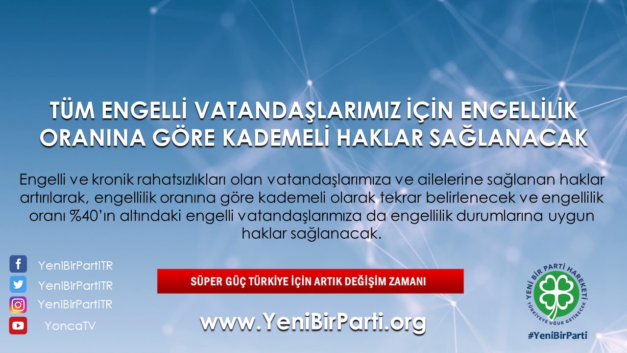 - Engelli ve kronik rahatsızlıkları olan vatandaşlarımıza ve ailelerine sağlanan haklar artırılarak, engellilik/işgöremezlik oranına göre kademeli olarak tekrar belirlenecek ve engellilik/işgöremezlik oranı %40’ın altındaki engelli vatandaşlarımıza da engellilik/işgöremezlik durumlarına uygun haklar sağlanacaktır.