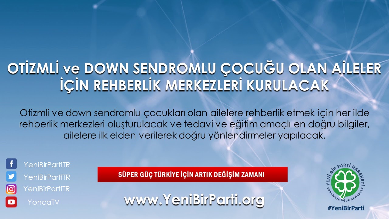 - Otizm, Down Sendromu, dikkat dağınıklığı, hiperaktivite sorunları ve özel öğrenme güçlüğü yaşayan çocukları olan ailelere rehberlik etmek için her ilde rehberlik merkezleri oluşturulacak ve tedavi ve eğitim amaçlı en doğru bilgiler, ailelere ilk elden verilerek doğru yönlendirmeler yapılacaktır.