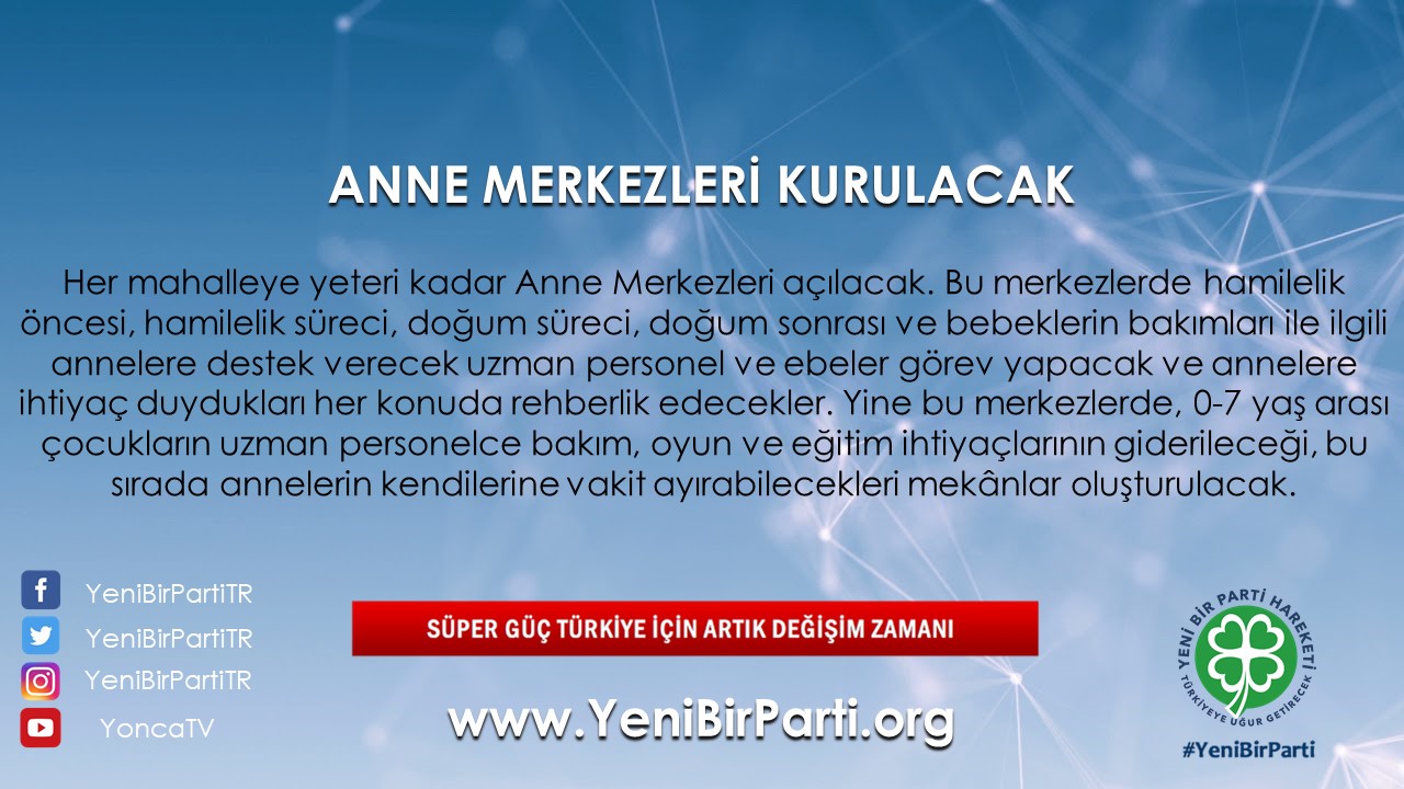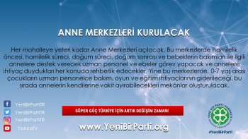- Her mahalleye yeteri kadar Anne Merkezleri açılacaktır. Bu merkezlerde hamilelik öncesinde, hamilelik ve doğum sürecinde ve doğum sonrasında annelere destek verecek uzman personel ve ebeler görev yapacak ve annelere ihtiyaç duydukları her konuda rehberlik edeceklerdir. Yine bu merkezlerde, 0-7 yaş arası çocukların uzman personelce bakım, oyun ve eğitim ihtiyaçlarının giderileceği, bu sırada annelerin kitap okuyarak veya diğer annelerle sohbet ederek vakit geçirebilecekleri mekânlar oluşturulacaktır.