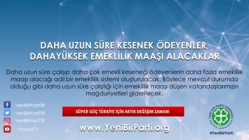 - Daha uzun süre çalışıp daha çok emekli keseneği ödeyenlerin, ödedikleri primle orantılı olarak daha fazla emekli maaşı alması sağlanacaktır. Bunun için emekli maaşı ödemeleri, emekli olana kadar Sosyal Güvenlik Kurumuna ödenen kesintilerin toplam tutarıyla orantılı olarak belirlenerek, bu konuda da adalet tesis edilecek ve mevcut durumda olduğu gibi daha uzun süre çalıştığı için emeklilik maaşı düşen vatandaşlarımızın mağduriyetleri giderilecektir.