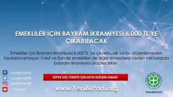 - Emekliler için bayram ikramiyesi, 6.000 TL’ye çıkarılacaktır. Bu düzenlemeden faydalanamayan Vakıf ve Sandık emeklileri de diğer emeklilere verilen miktarlarda bayram ikramiyesi alabileceklerdir.