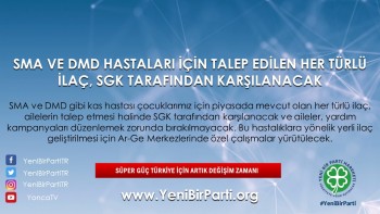- SMA ve DMD gibi kas hastası çocuklarımız için piyasada mevcut olan her türlü ilaç, ailelerin talep etmesi halinde SGK tarafından karşılanacak ve aileler, yardım kampanyaları düzenlemek zorunda bırakılmayacaktır.