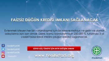 - Evlenmek isteyen her bir vatandaşımız için bir kereye mahsus ve gelin ve damat adaylarına ayrı ayrı olmak üzere, kamu bankalarından 250.000 TL tutarında 3 yıl vadeli faizsiz kredi imkânı (düğün kredisi) sağlanacaktır.