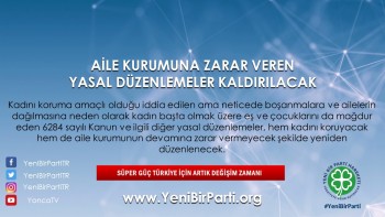 - Kadını koruma amaçlı olduğu iddia edilen ama neticede boşanmalara ve ailelerin dağılmasına neden olarak kadın başta olmak üzere eş ve çocuklarını da mağdur eden 6284 sayılı Kanun ve ilgili diğer yasal düzenlemeler, hem kadını koruyacak hem de aile kurumunun devamına zarar vermeyecek şekilde yeniden düzenlenecektir.