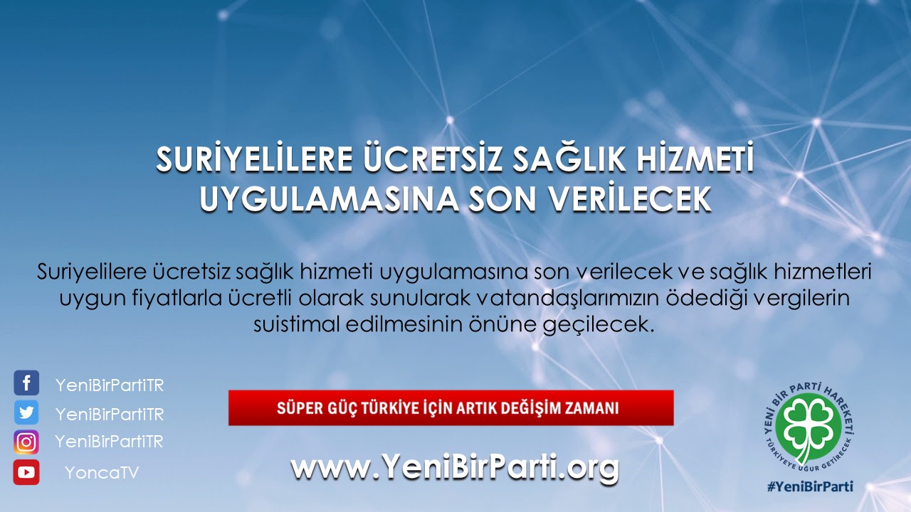 - Suriyeli sığınmacılara ücretsiz sağlık hizmeti uygulamasına son verilecek ve sağlık hizmetleri ücretli olarak sunularak vatandaşlarımızın ödediği vergilerin suistimal edilmesinin önüne geçilecektir.