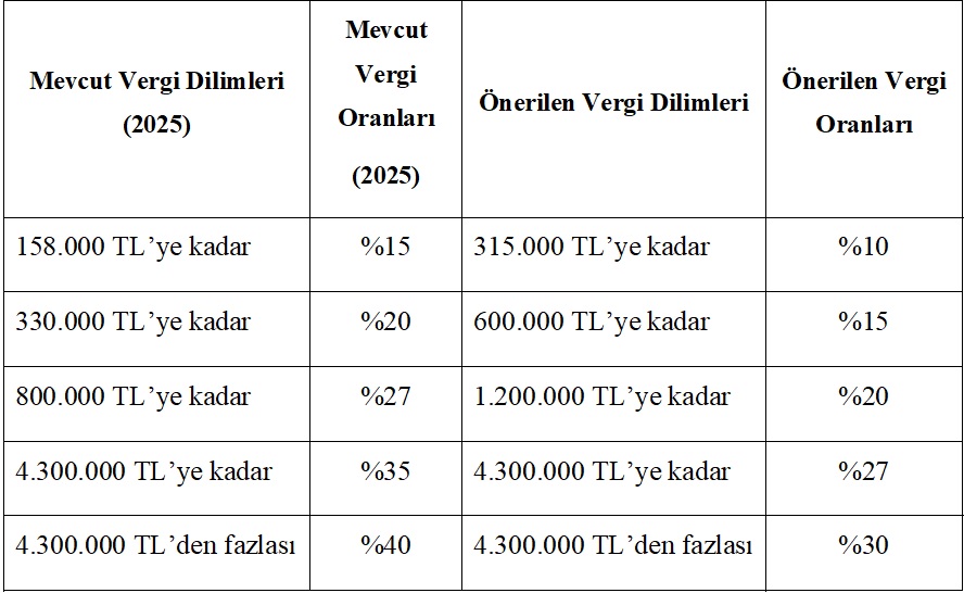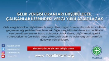 - Gelir vergisi oranları düşürülerek ilk vergi dilimi, asgari ücretin yıl içinde ikinci dilime geçmeyeceği şekilde düzenlenecektir. Diğer vergi dilimleri de makul aralıklarla yeniden düzenlenerek başta çalışanlar olmak üzere düşük ve orta gelirli vatandaşlarımız üzerindeki vergi yükü azaltılacak ve vatandaşlarımızın refah düzeyleri yükseltilecektir.