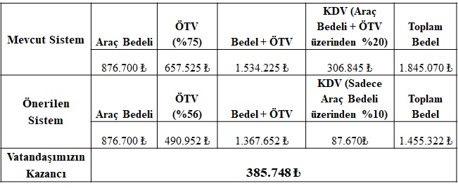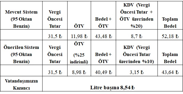 - Verginin vergisinin alınması gibi uygulamalara son verilecektir. Hem KDV, hem de ÖTV alınan ürünlerde her iki vergi tutarı da, ürünün vergisiz satış bedeli üzerinden hesaplanacaktır. Böylece akaryakıt, otomobil, beyaz eşya vb. ürünlerin fiyatlarında, hem vergi (ÖTV ve KDV) indirimi nedeniyle, hem de verginin hesaplanma yöntemindeki değişiklik (vergiden vergi alınmaması) nedeniyle büyük ucuzlama olacaktır. Bu ürünlerdeki ucuzlamanın hem üretime hem de tüketime etkileriyle, ticaret artacak ve toplanan vergi tutarlarında kamu maliyesini etkileyecek bir azalma olmayacaktır. (Mevcut vergilere göre ve önerilen vergi indirimleri sonrası fiyat hesaplamaları için tablolara bakınız)