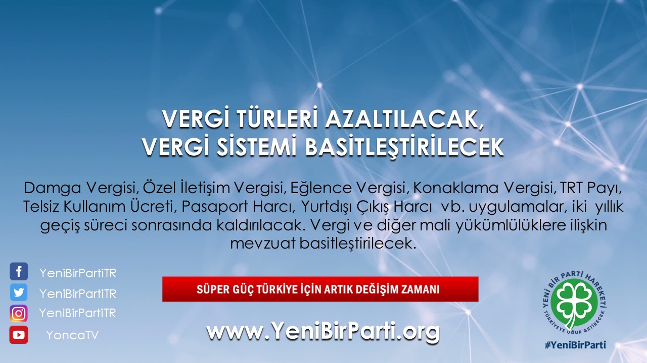 - Vergi türleri azaltılacak, istisna ve muafiyetler kaldırılarak vergi ve diğer mali yükümlülük oranları, tüm mükellefler için eşitlenecektir. Böylece vergi ve diğer mali yükümlülüklere ilişkin mevzuat basitleştirilecek ve herkes tarafından kolayca anlaşılabilir hale getirilecektir.