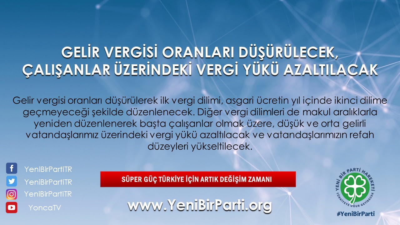 - Gelir ve Kurumlar Vergileri gibi dolaysız vergiler, ilk etapta en az %25 oranında indirilmek üzere kademeli olarak adil ve makul seviyelere indirilecektir.