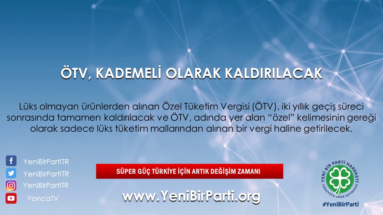 - Lüks olmayan ürünlerden alınan Özel Tüketim Vergisi (ÖTV), iki yıllık geçiş süreci sonrasında tamamen kaldırılacak ve ÖTV, adında yer alan “özel” kelimesinin gereği olarak sadece lüks tüketim mallarından alınan bir vergi haline getirilecektir.