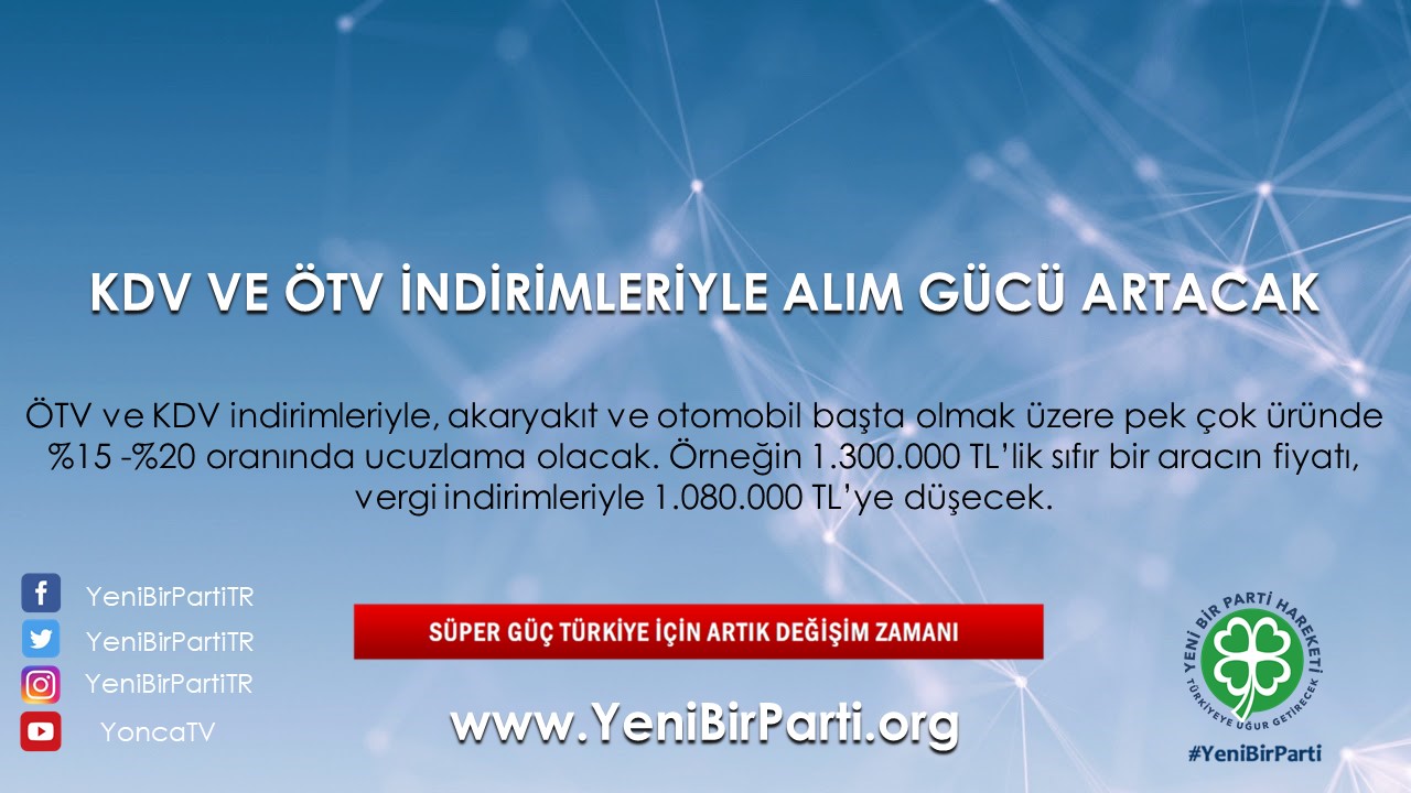 - Başta ÖTV ve KDV gibi dolaylı vergiler olmak üzere, tüm vergilerde ilk etapta %25 olmak üzere kademeli indirimler yapılacaktır.