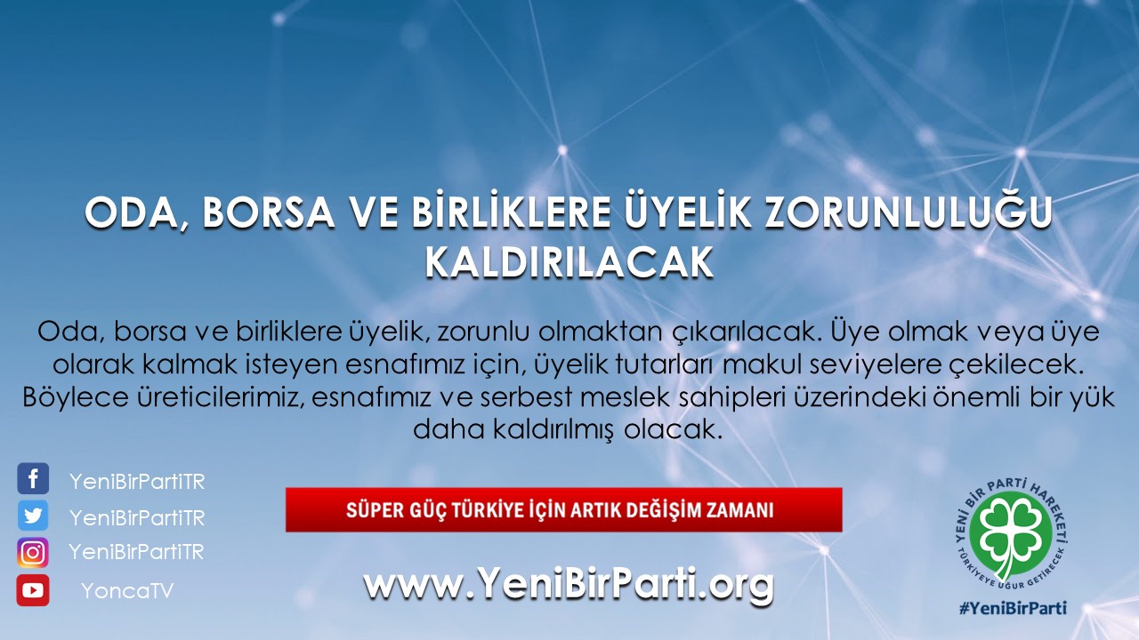 - Oda, borsa ve birliklere üyelik, zorunlu olmaktan çıkarılacaktır. Üye olmak veya üye olarak kalmak isteyen esnafımız için, üyelik tutarları makul seviyelere çekilecektir. Böylece üreticilerimiz ve esnafımız üzerindeki önemli bir yük daha kaldırılmış olacaktır.