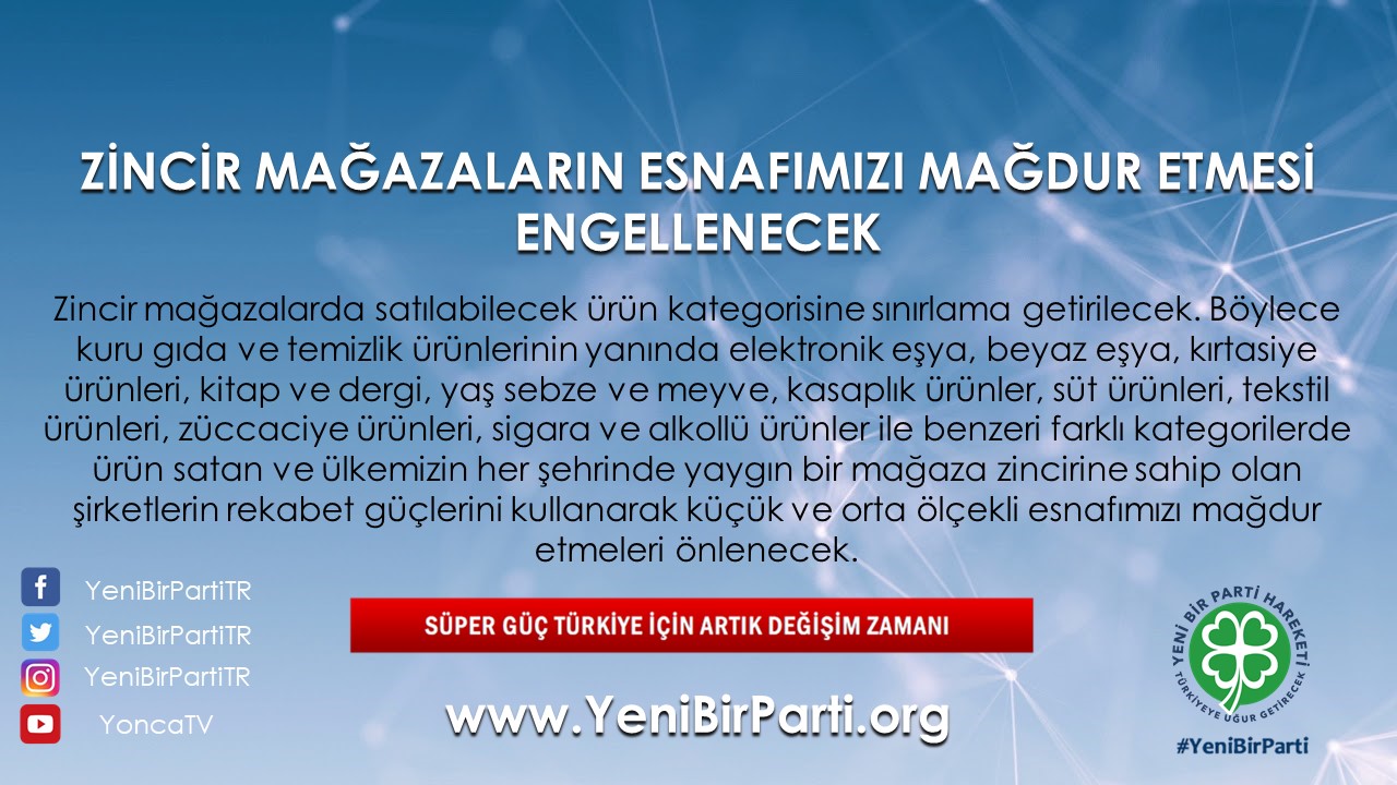- Zincir mağazalarda satılabilecek ürün kategorisine sınırlama getirilecektir. Böylece kuru gıda ve temizlik ürünlerinin yanında elektronik eşya, beyaz eşya, kırtasiye ürünleri, kitap ve dergi, yaş sebze ve meyve, kasaplık ürünler, süt ürünleri, tekstil ürünleri, züccaciye ürünleri, sigara ve alkollü ürünler ile benzeri farklı kategorilerde ürün satan ve ülkemizin her şehrinde yaygın bir mağaza zincirine sahip olan şirketlerin rekabet güçlerini kullanarak küçük ve orta ölçekli esnafımızı mağdur etmeleri önlenecektir.