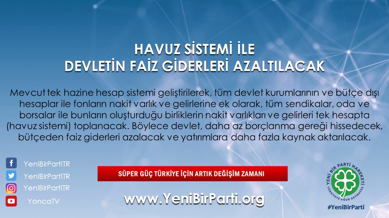 - Mevcut tek hazine hesap sistemi geliştirilerek, tüm devlet kurumlarının ve bütçe dışı hesaplar ile fonların nakit varlık ve gelirlerine ek olarak, tüm sendikalar, oda ve borsalar ile bunların oluşturduğu birliklerin nakit varlıkları ve gelirleri tek hesapta (havuz sistemi) toplanacaktır. Böylece devlet, daha az borçlanma gereği hissedecek, bütçeden faiz giderleri azalacak ve yatırımlara daha fazla kaynak aktarılacaktır.