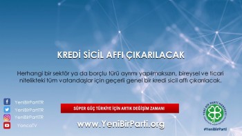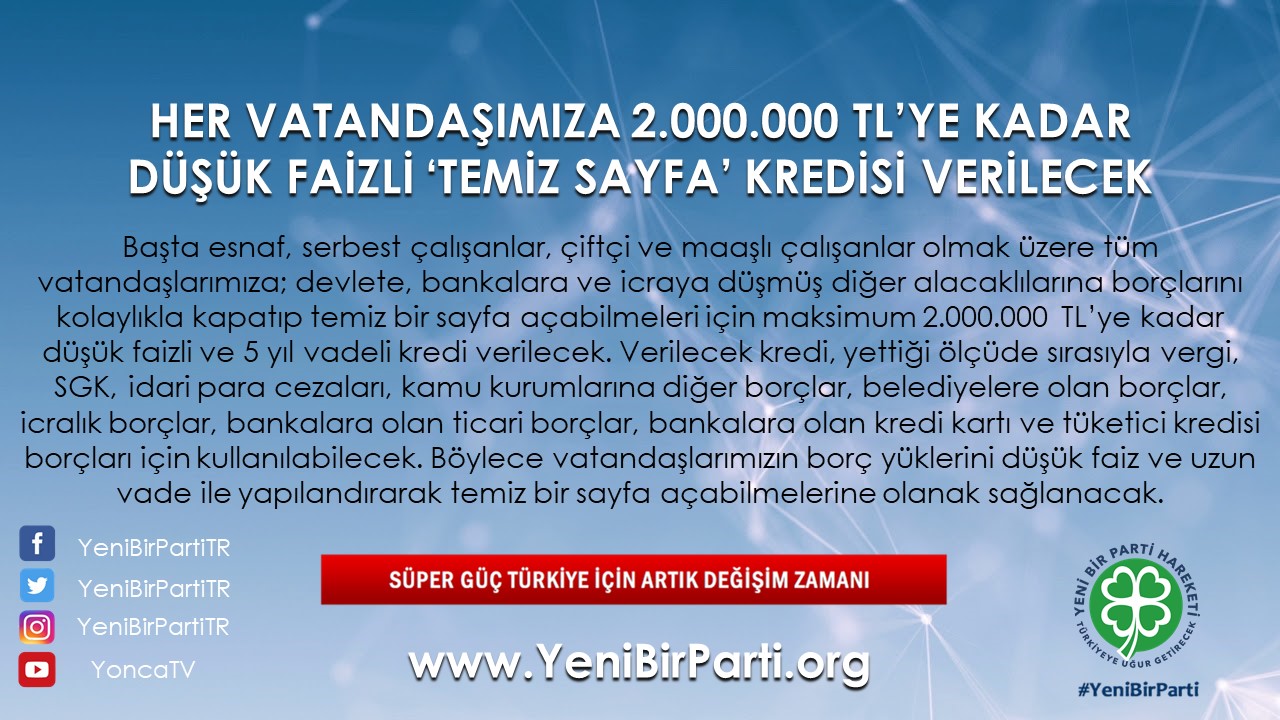 - Başta esnaflar, serbest çalışanlar, çiftçiler ve maaşlı çalışanlar olmak üzere tüm vatandaşlarımıza; devlete, bankalara ve icraya düşmüş diğer alacaklılarına borçlarını kolaylıkla kapatıp temiz bir sayfa açabilmeleri için maksimum 2.000.000 TL’ye kadar düşük faizli ve 5 yıl vadeli kredi verilecektir. Verilecek kredi, yettiği ölçüde sırasıyla vergi, SGK, idari para cezaları, kamu kurumlarına diğer borçlar, belediyelere olan borçlar, icralık borçlar, bankalara olan ticari borçlar, bankalara olan kredi kartı ve tüketici kredisi borçları için kullanılabilecektir. Böylece vatandaşlarımızın borç yüklerini düşük faiz ve uzun vade ile yapılandırarak temiz bir sayfa açabilmelerine olanak sağlanacaktır.