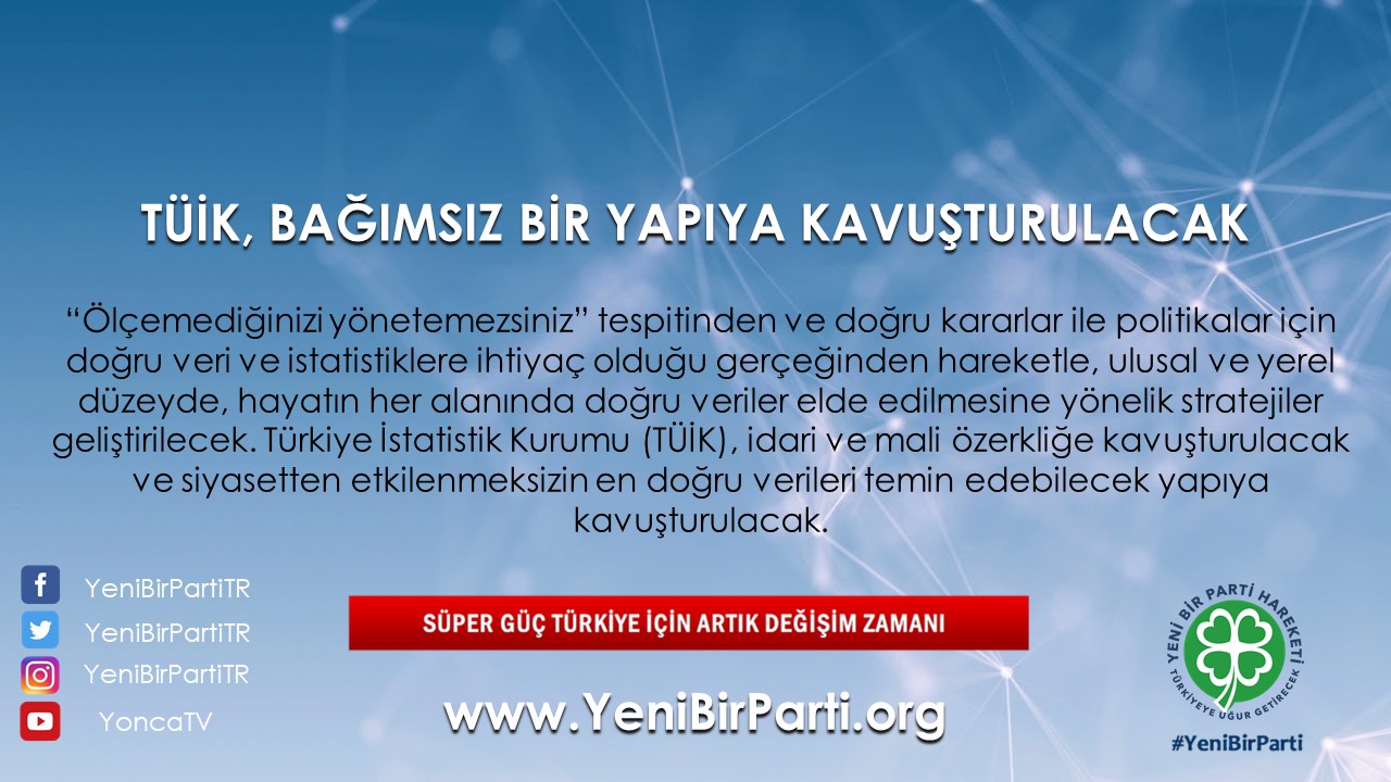 - “Ölçemediğinizi yönetemezsiniz” tespitinden ve doğru kararlar ile politikalar için doğru veri ve istatistiklere ihtiyaç olduğu gerçeğinden hareketle, ulusal ve yerel düzeyde hayatın her alanında doğru veriler elde edilmesine yönelik stratejiler geliştirilecektir. Türkiye İstatistik Kurumu (TÜİK), idari ve mali özerkliğe kavuşturulacak ve siyasetten etkilenmeksizin en doğru verileri temin edebilecek yapıya kavuşturulacaktır.