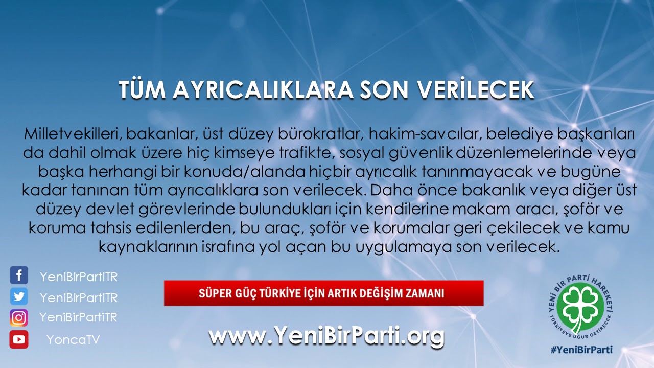 - Milletvekilleri, bakanlar, üst düzey bürokratlar, askerler, hakim-savcılar, belediye başkanları da dahil olmak üzere hiç kimseye trafikte, sosyal güvenlik düzenlemelerinde veya başka herhangi bir konuda/alanda hiçbir ayrıcalık tanınmayacak ve bugüne kadar tanınan tüm ayrıcalıklara son verilecektir.