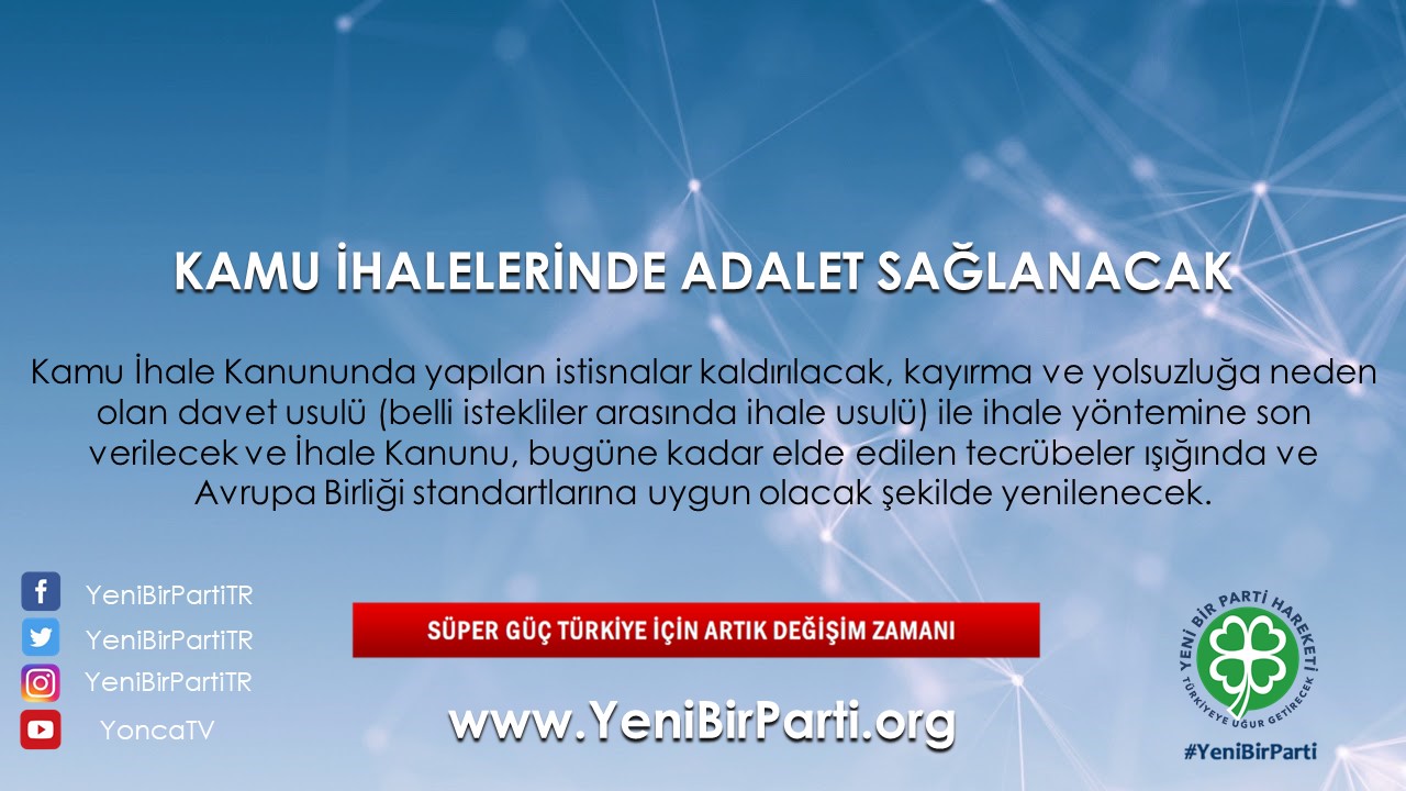 - Kamu İhale Kanununda yapılan istisnalar kaldırılacak, kayırma ve yolsuzluğa neden olan “davet usulü” (belli istekliler arasında ihale usulü) ile ihale yöntemine son verilerek İhale Kanunu, bugüne kadar elde edilen tecrübeler ışığında ve Avrupa Birliği standartlarına uygun olacak şekilde yenilenecektir.