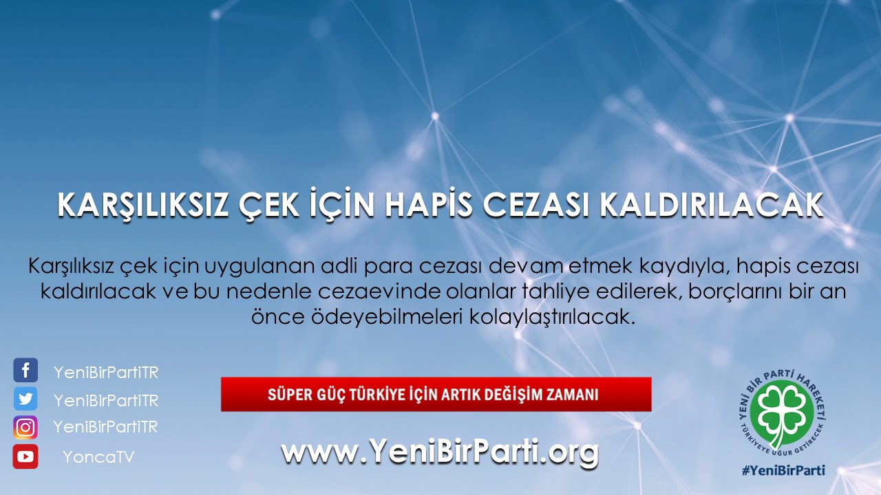 - Karşılıksız çek için uygulanan adli para cezası devam etmek kaydıyla, hapis cezası kaldırılacak ve bu nedenle cezaevinde olanlar tahliye edilecektir.