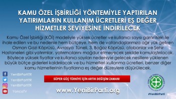 - Kamu Özel İşbirliği (KÖİ) modeliyle yüksek geçiş ücretleri ve geçiş sayısı garantileri ile ihale edilen Osman Gazi Köprüsü, Avrasya Tüneli, 3. Boğaz Köprüsü, otobanlar ve Şehir Hastaneleri gibi yatırımlar, verilen kullanım garantileri nedeniyle hem bütçeye ağır yükler getirmekte, hem de yüksek fiyatlar nedeniyle vatandaşlarımızı zorlamaktadır. Vatandaşlarımızı bu ağır yükten kurtarmak amacıyla, bu gibi yatırımlar için yatırımcıların bugüne kadar yaptıkları her türlü masraf, bugüne kadar elde ettikleri gelirler çıkarıldıktan sonra üzerine makul bir kâr marjı eklenerek kendilerine ödenecek ve KÖİ yatırımları kamulaştırılacaktır. Böylece yüksek fiyatlar ve geçiş sayıları nedeniyle gelecek nesillere yüklenen büyük bütçe giderleri kaldırılacak ve bu hizmetleri kullanma ücretleri, benzer diğer kamu hizmetlerinin fiyatlarına eş değer düzeylere düşürülecektir.