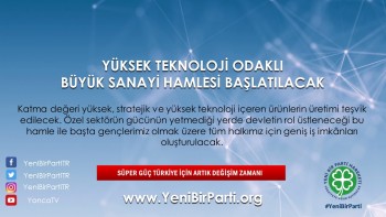 - Katma değeri yüksek, stratejik ve yüksek teknoloji içeren ürünlerin üretimi teşvik edilecek ve bunun için özel sektörün gücü yetmediği takdirde bu yatırımlar devlet tarafından yapılacaktır. Devlet tarafından yatırım yapıldığı takdirde, bu yatırımlar üretim aşamasına geldikten sonra özelleştirilecektir. Bu özelleştirmeler yüksek oranda, fabrikaların bulunduğu bölge halkının hisse sahibi olmaları şeklinde yapılacak ve bölge halkının yatırımları sahiplenmesi sağlanacaktır. Böylece ihtiyaç olması halinde, “Yap-İşlet-Devret” modelinin tersi bir niteliğe sahip olan “Yap-İşlet-Özelleştir” yöntemiyle ülkemizin bir an önce yüksek teknoloji üretir hale gelmesi sağlanacaktır.
