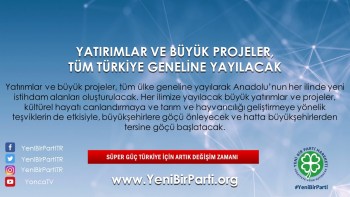 - Yatırımlar ve büyük projeler, tüm ülke geneline yayılarak Anadolu’nun her ilinde yeni istihdam alanları oluşturulacaktır. Her ilimize yayılacak büyük yatırımlar ve projeler, kültürel hayatı canlandırmaya ve tarım ve hayvancılığı geliştirmeye yönelik teşviklerin de etkisiyle, büyükşehirlere göçü önleyecek ve hatta büyükşehirlerden tersine göçü başlatacaktır.