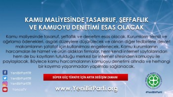 - Kamu maliyesinde tasarruf, şeffaflık ve denetim esas olacaktır. Kamu kurumlarının harcamaları ile hizmet ve ürün aldıkları firmalar/kurumlar, hem kendi web sayfalarından hem de bu kayıtların tutulduğu merkezi bir web sitesinden kamuoyu ile paylaşılacaktır. Böylece kamu harcamalarının kamuoyu denetimi altında ve herhangi bir kayırma vs. yaşanmadan yapılması sağlanacaktır.