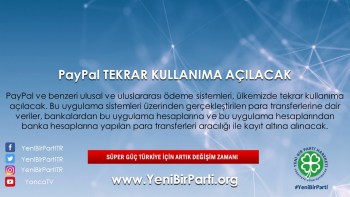 - PayPal ve benzeri ulusal ve uluslararası ödeme sistemleri, ülkemizde tekrar kullanıma açılacaktır. Bu uygulama sistemleri üzerinden gerçekleştirilen para transferlerine dair veriler, bankalarımızdan bu uygulama hesaplarına ve bu uygulama hesaplarından banka hesaplarına yapılan para transferleri aracılığı ile kayıt altına alınacaktır.