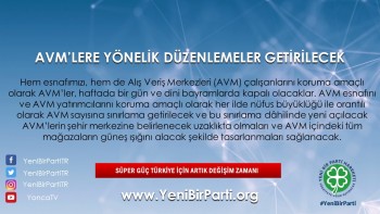 - Hem esnafımızı, hem de Alış Veriş Merkezlerinin (AVM) çalışanlarını koruma amaçlı olarak AVM’lerin haftada bir gün ve dini bayramlarda kapalı olmalarına yönelik düzenleme yapılacaktır.
